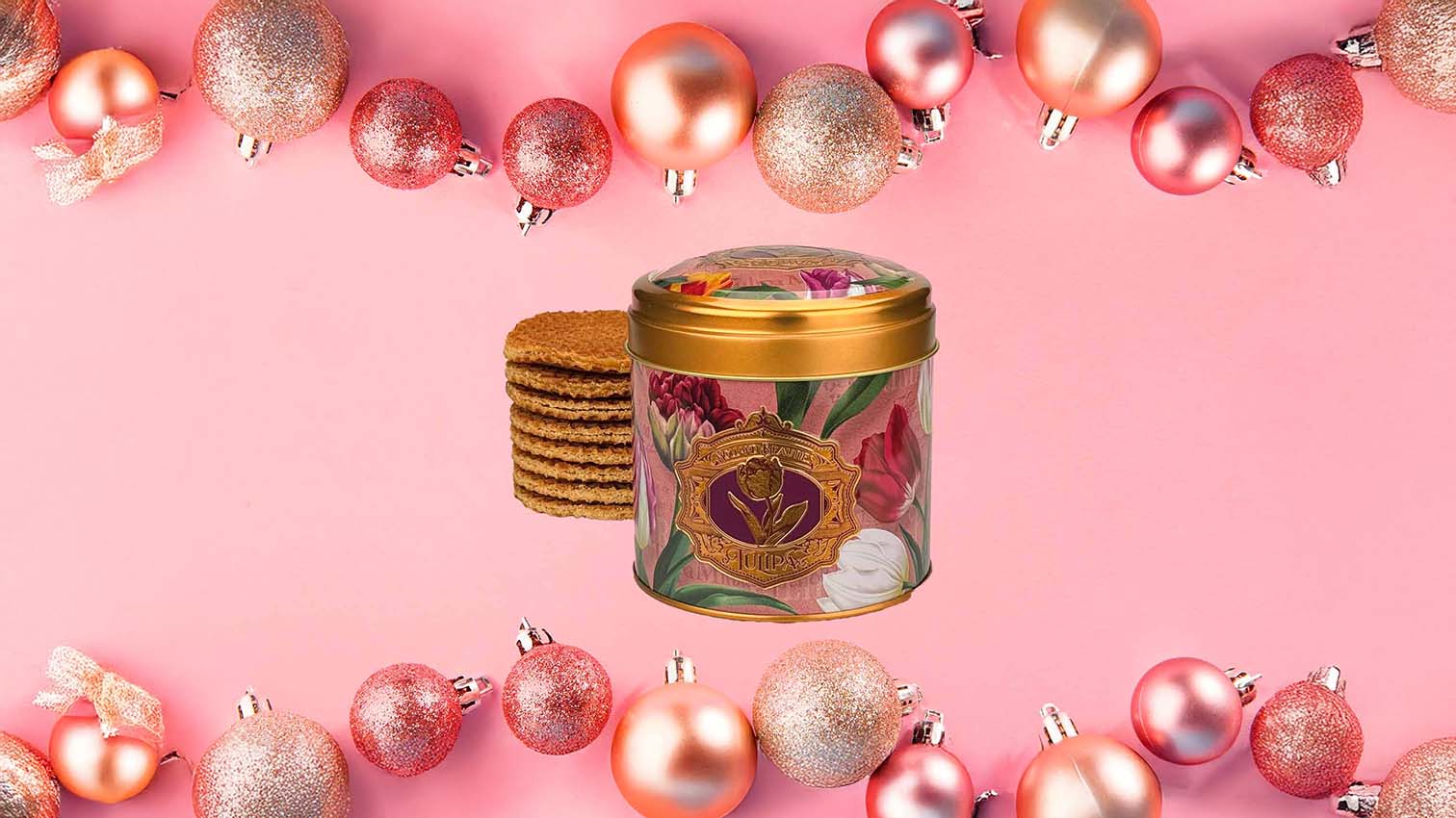 Paket: Burk med sirapsvåfflor (blik stroopwafels) serien "Pretty Tulips" tulpaner/rosa och präglad logo från Matix Souvenir Holland